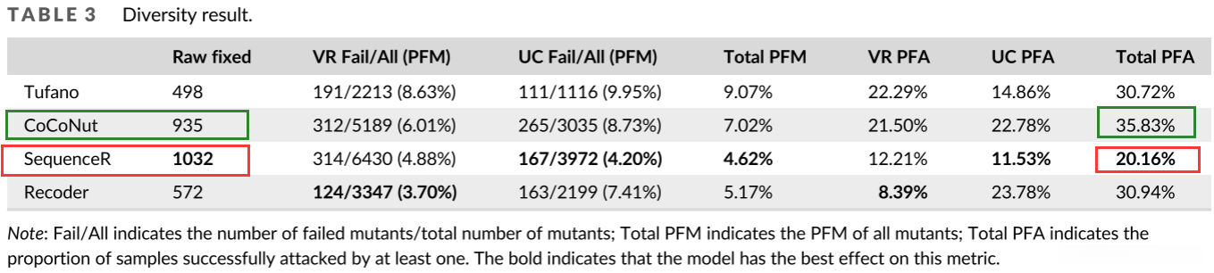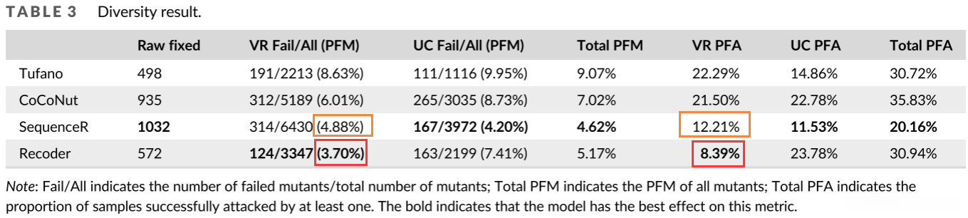 表3介绍了多样性实验的结果。在多样性实验中,SequenceR是最突出的模型。但即便如此,SequenceR的PFA超过20%,这意味着超过20%的可以修复的原始样本含有无法修复的突变。这也意味着,超过20%的SequenceR成功修复是不可靠的。CoCoNut受到的影响最大,在可以修复的样本中,超过35%的样本存在修复失败的突变。这表明NPR模型是脆弱的,在语义一致的突变下,NPR模型的修复能力受到严重挑战。