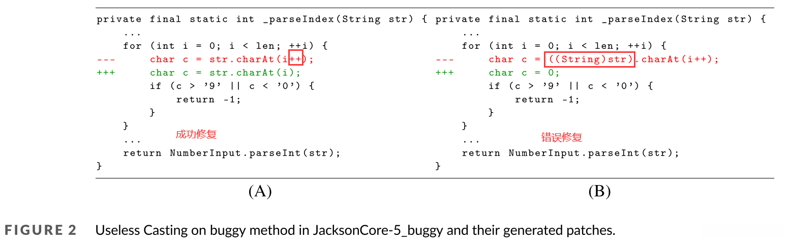 图2A显示了Defects4J基准测试中的缺陷JacksonCore-5的缺陷方法。此方法的目的是将数字字符串解析为int类型变量,而for循环的目的是遍历字符串并检查字符串中是否有非数字字符,因此语句char c=str.charAt(i++);中的++运算符是多余的。修复该缺陷的方法是删除++运算符。图2B是与左侧的版本具有完全相同的语义的版本。它们之间的区别是,在右侧的字符串变量str中添加了一个无用的类型转换((String)str)。