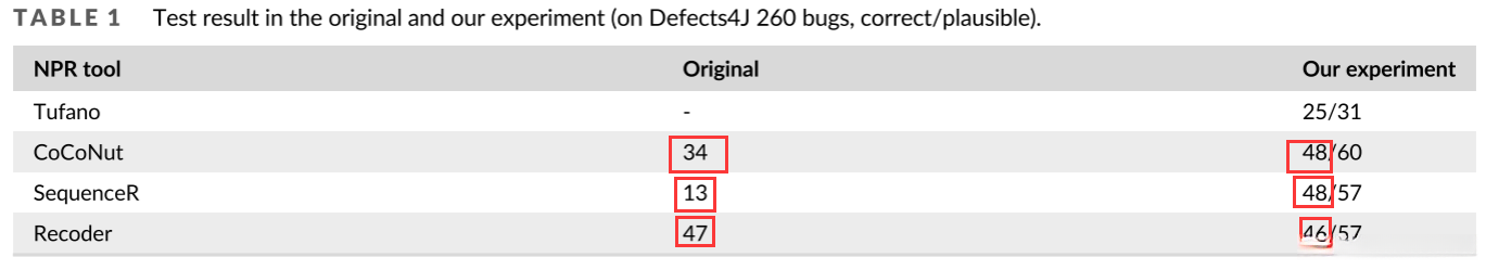 在NPR研究中,确定缺陷行的位置是一种常见的做法。在我们的四个模型中,Tufano是唯一一款没有标明缺陷行的模型。其他三种模型都以不同的形式指示了缺陷行,限制了修复的范围。CoCoNut使用单个编码器对缺陷行进行编码,SequenceR使用特殊的token来指示缺陷行,Recoder将缺陷行的位置作为输入参数。