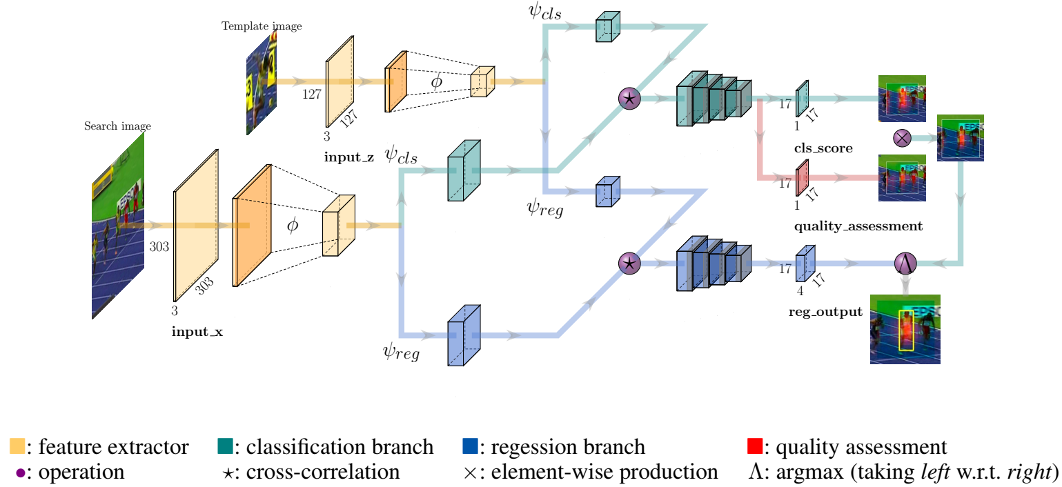 在完成互相关运算后,在完成互相关运算后随后分别设计了两个不同的处理模块:一个是分类模块(classification head),另一个是回归模块(regression head)。其中分类模块采用\psi_{cls}作为输入,在针对特征图上的每一个点进行分类操作时,则等价于在原始图像中对应区域进行分patch处理(即每个patch大小为17×17×1)。而回归模块则采用\psi_{reg}作为输入,并输出额外的偏移量(大小为17×17×4),用于调整边界框的位置以提高预测精度。