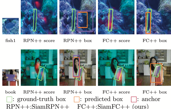 第一行中比较SiamRPN++与SiamFC++的分数分布情况:不论成功与否情况下,SiamRPN++的分类分数均呈现相似的分布规律;相比之下,SiamFC++的表现更为科学:在目标跟踪成功的场景下,其分数应当集中在高得分区域;而在目标跟踪失败的情况下,则应集中于低得分区域.第二行通过绘制不同状态下的输出边界框与gt之间的IoU值分布直方图,展示了基于锚点的方法在目标状态估计上存在的偏差问题:SiamRPN++算法在预测边界框时,其预测结果更倾向于与锚框产生较高的重叠程度,而非与实际的目标框(gt)产生较大的重叠度.