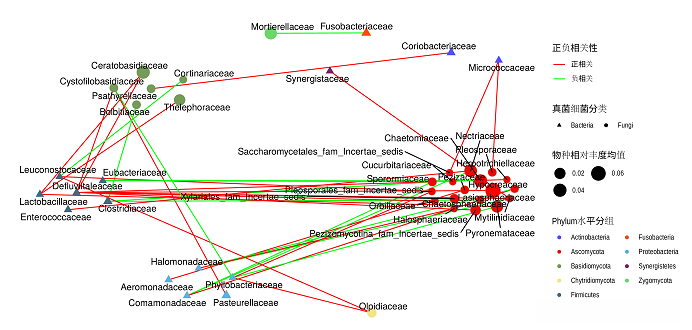 (1)图中形状象征不同的检测类型:该图表展示的是细菌与真菌之间存在的关联关系,并且这种图表同样涵盖了物种间的相互作用及其功能关联。