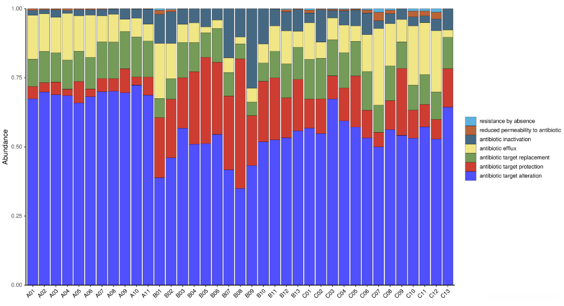 采用FMAP软件将经过严格筛选的优化样本与参考数据库进行对比(以Diamond算法为基础)。根据比对结果,统计出每个样本对应于各ARO reference sequence的reads数,并进而计算出各个物种相对于该参考系统的丰度。利用数据库对应的物种-功能关系和基因-药物作用关系等信息基础,在此基础上分别计算上述三个分类类别中各类别的丰度。