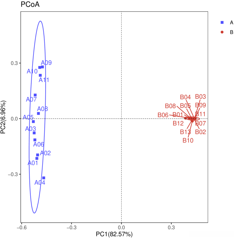 评估β多样性(beta diversity)的方法是用于比较两个样本在物种组成差异程度的一种统计手段。该方法通过分析各物种群在样本中的丰度变化情况,并计算两样本之间的β多样性数值。常用的具体指标包括Bray-Curtis和Jaccard指数等多选指标系统。我们计划基于这两种方法构建的丰度矩阵,在此基础上分别进行非度量多维标定(NMDS)、主坐标分析(PCoA)以及构建聚类树图等多元统计分析