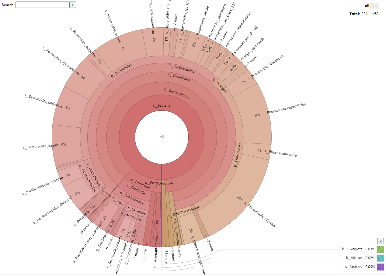 采用 krona 软件对物种注释数据进行可视化呈现,在结果显示中发现:圆圈由内而外依次对应各类别层次分布特征,并通过扇区面积大小反映各注释类别的占比比例。