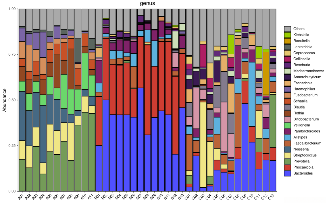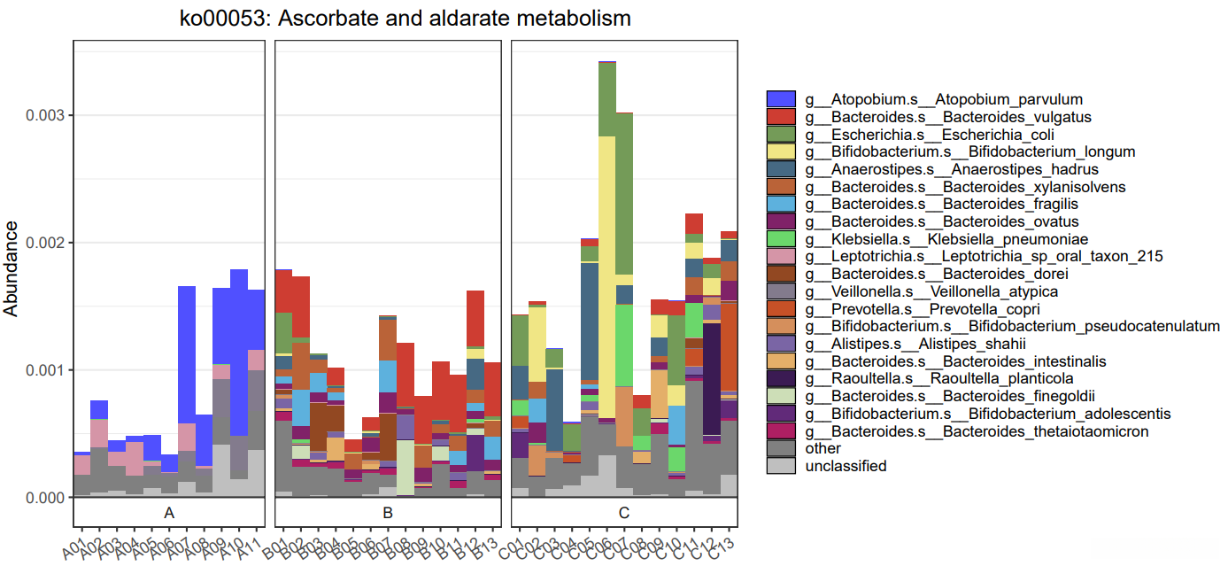 基于 HUMAnN3 的分析结果推导出功能的物种来源后, 制作功能物种来源组成 Stratified 柱形图. 通过查看图表我们可以得知功能的丰度以及功能来源于哪些物种.