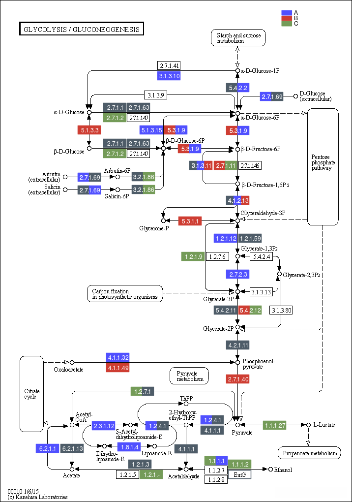 在 pathway(通路)图上进行颜色标记,在通路图中标注检测到的关键基因;对于具有不同功能特性的基因分组,在同一幅绘图中展示其对应的分类信息,并分别以不同的颜色框标出