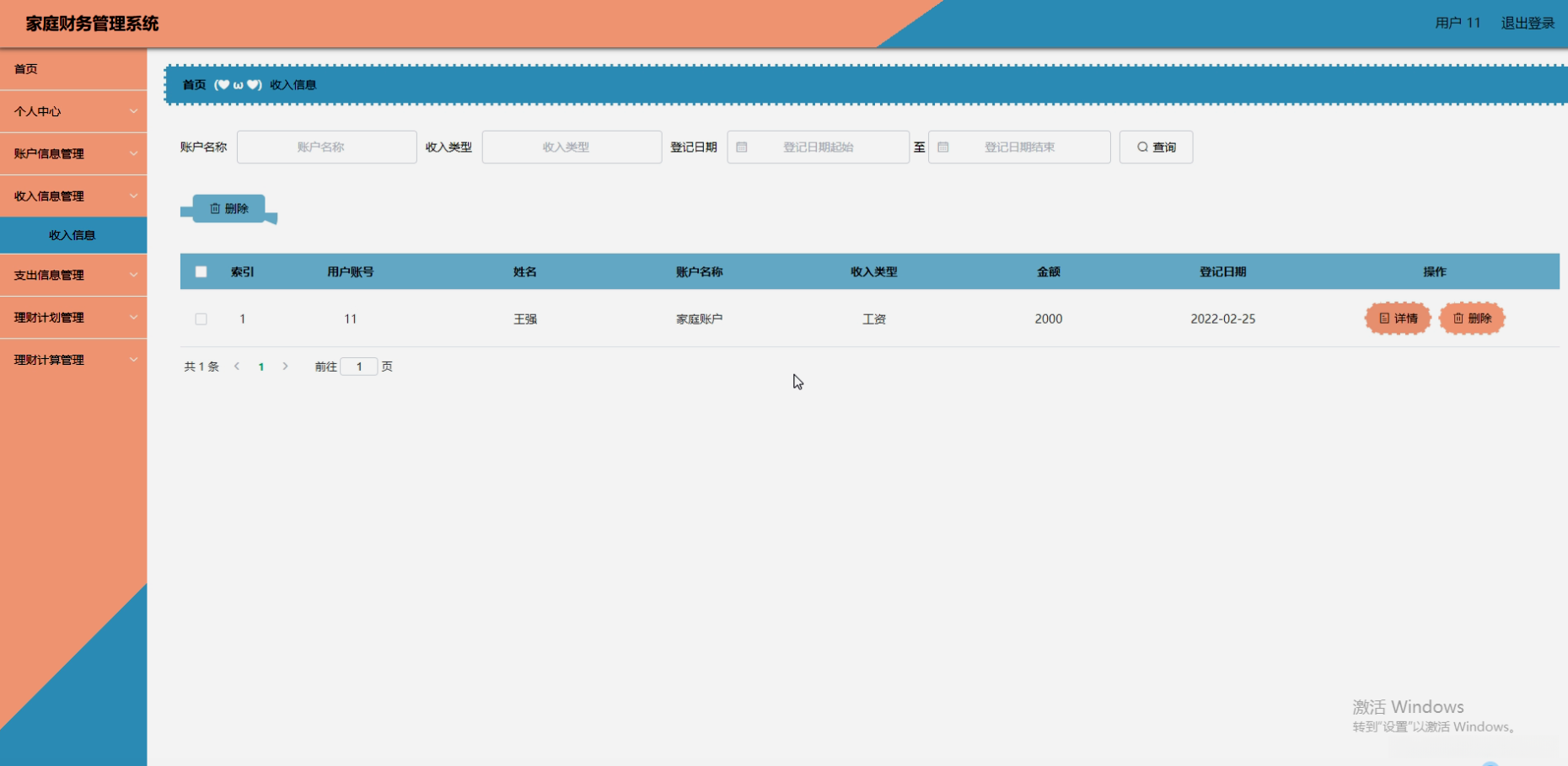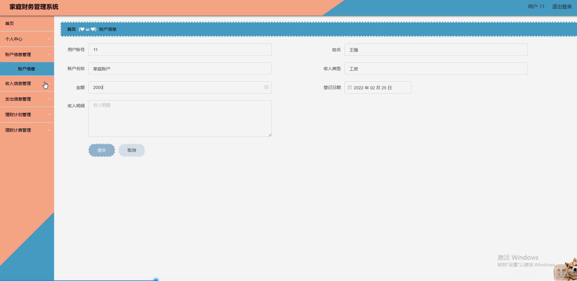 - 收入信息管理:系统将自动采集并完整记录家庭各项收入数据如工资奖金投资收益等并提供趋势分析功能。