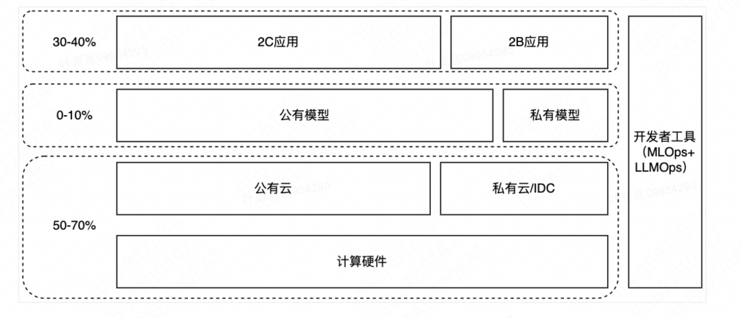 应用层 30-40%,模型层 0-10%,计算基础设施服务 50-70%