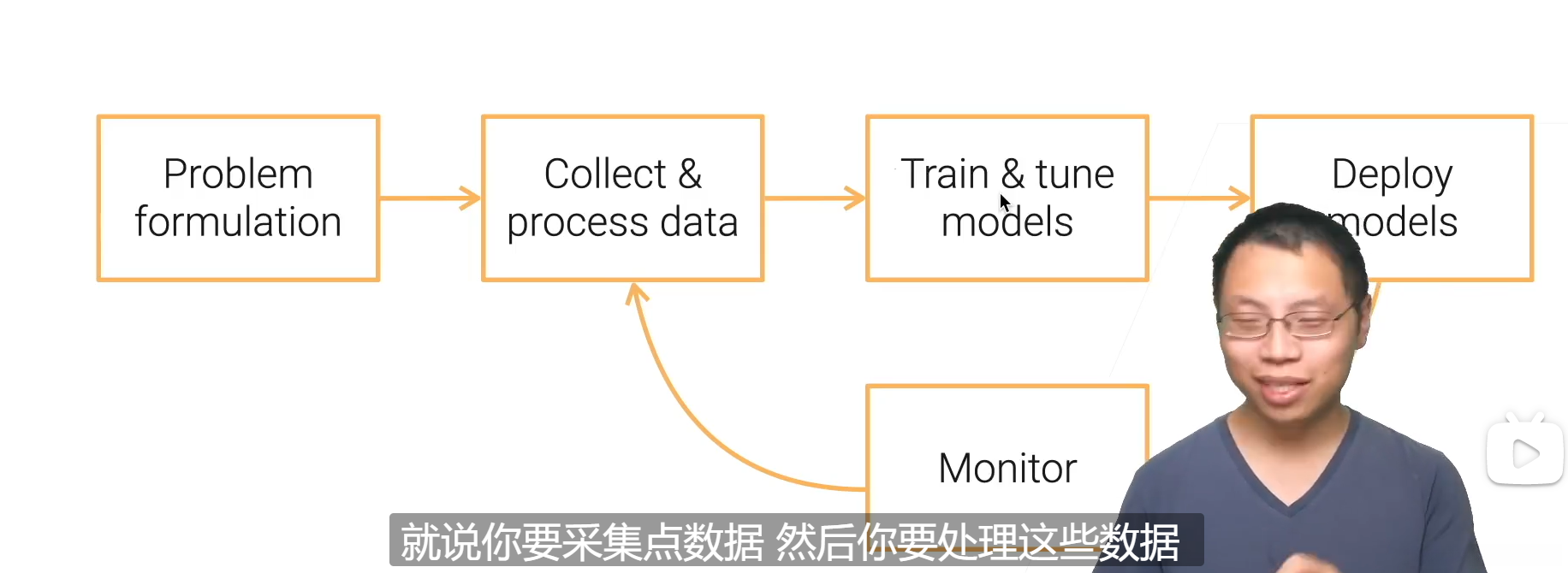3.把模型部署到线上进行实践。然后会收集到新的数据,再到步骤二,形成循环。