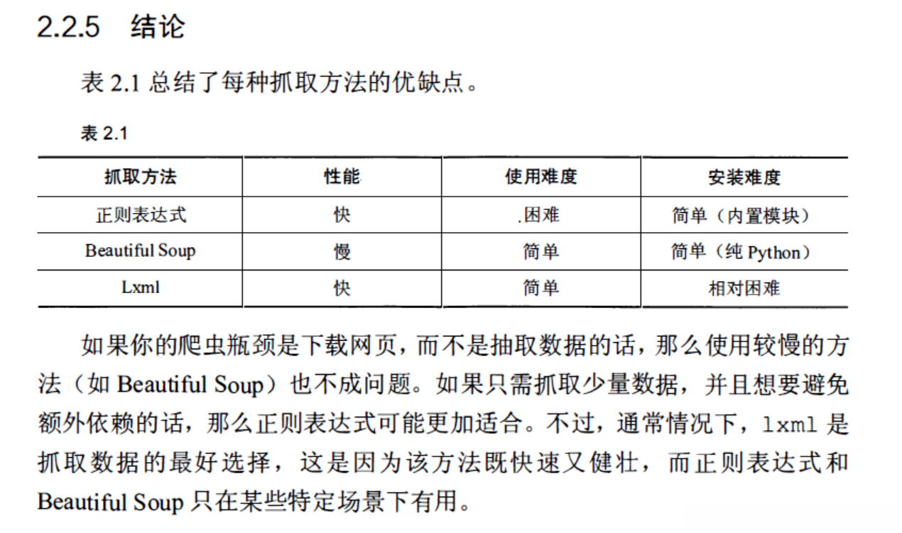 Lxml是以libxml2这一XML解析库为基础开发而成的Python封装模块。该模块采用C语言进行编写,在性能上显著优于BeautifulSoup工具。通过书中对比分析得出的结论可知,在爬取网页并进行数据采集的过程中,默认采用以下步骤:首先对网页源码进行解析(采用上述三种工具中的Lxml方法),随后选择所需数据(采用CSS选择器进行定位)。