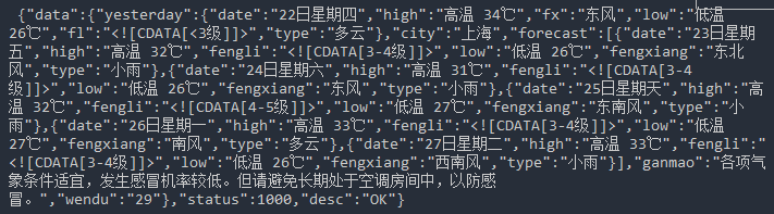 增加查询天气接口:http://wthrcdn.etouch.cn/weather_mini?city=上海,可查询最近5日天气,响应诸如”今天天气“、”明天天气“之类指令。使用gzip解压后得到json数据:
