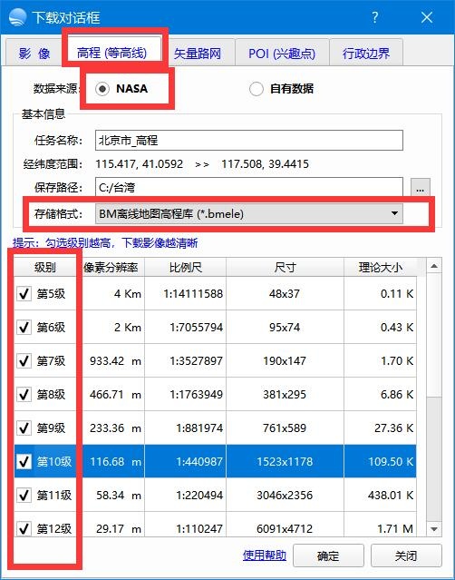 选择所需级别的等级,在高程测量中我们通常会设置至16级或17级之前的全部等级