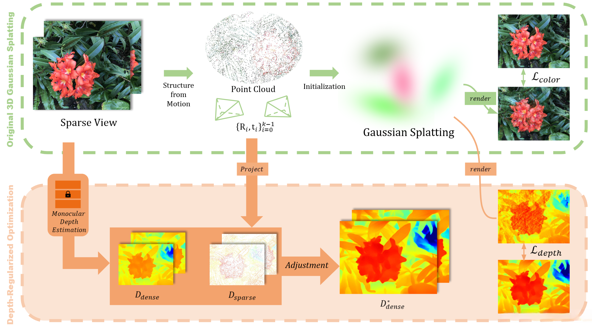 We estimated the depth map by employing a trained-in-advance monocular depth estimation model to adjust scale parameters and offset parameters via sparse COLMAP feature points.