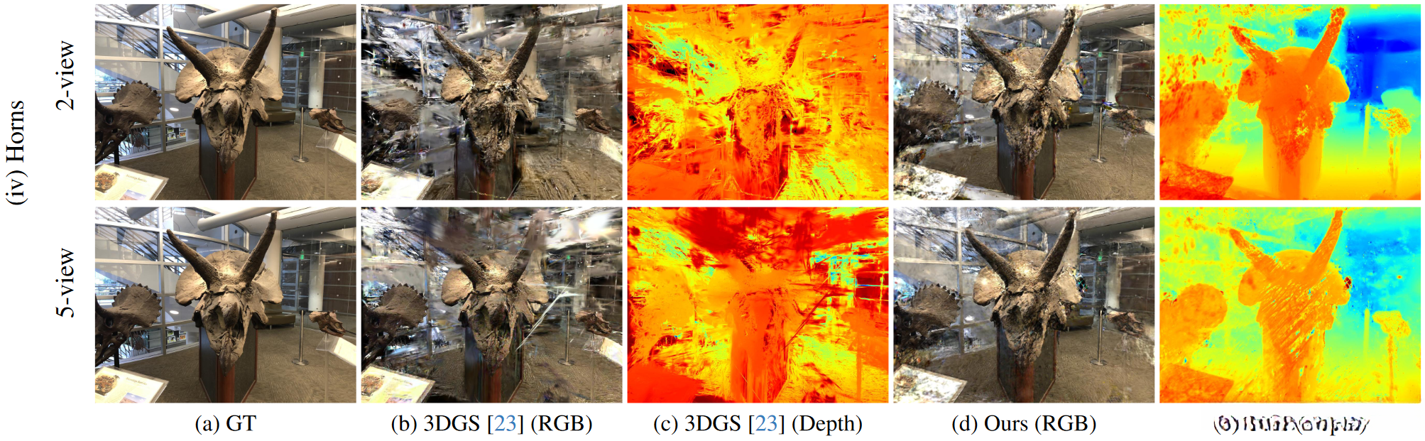 Representing a 3D scene using numerous Gaussian splats achieves highly accurate results. However, this approach tends to exhibit overfitting tendencies when the number of training images is limited.
