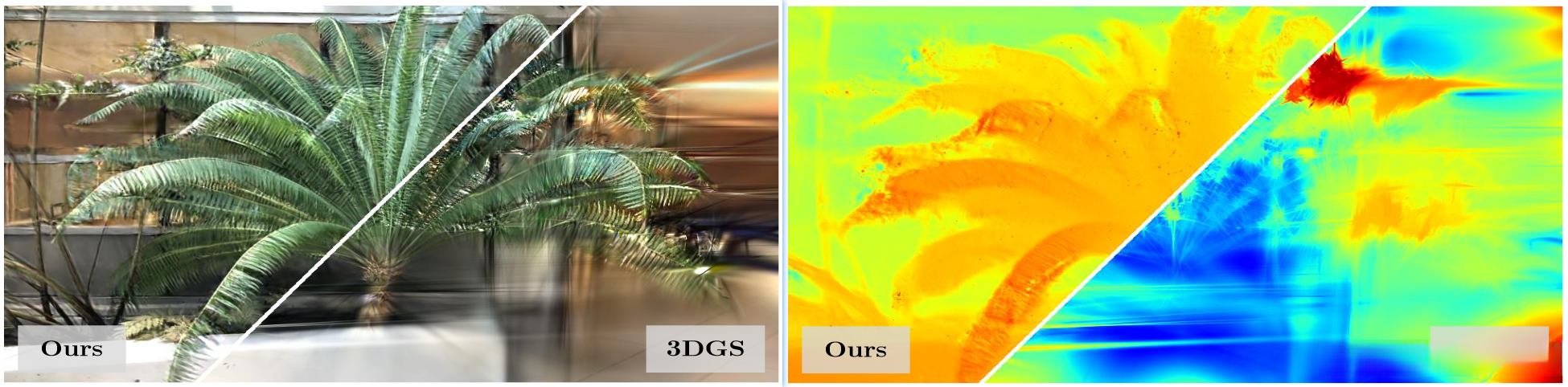 Our approach generates more accurate reconstruction outcomes than 3DGS by exploiting additional geometric cues. Our method generates stable geometry with superior performance in reconstruction quality compared to 3DGS.