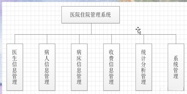 本系统采用的是自顶向下的分层模块设计方法,由于医院住院管理系统分为:医生信息管理、病人信息管理、病床信息管理、收费信息管理、统计分析和系统管理等功能,我们在设计过程中按其功能把它分成不同的模块。