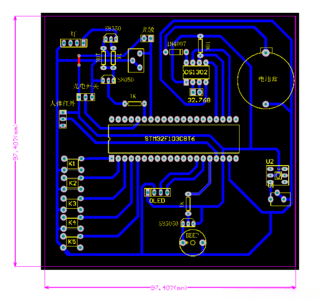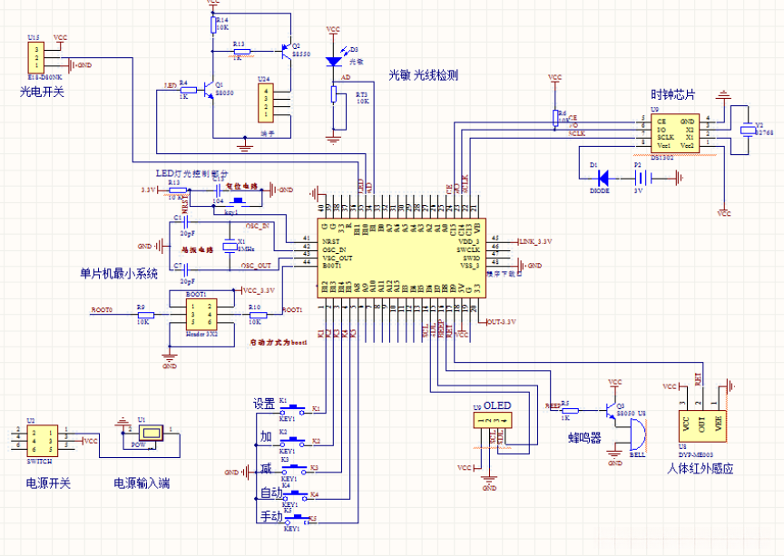 本系统集成STM32单片机与OLED液晶显示模块相结合的人工智能监控系统架构。该系统由以下核心组件构成:首先包含光敏电阻作为环境检测元件;其次配置光电开关作为状态监测装置;然后通过按键设置完成报警功能;最后整合人体红外传感器模块用于环境状态监控,并接入DS1302主控芯片以实现精确的时间管理