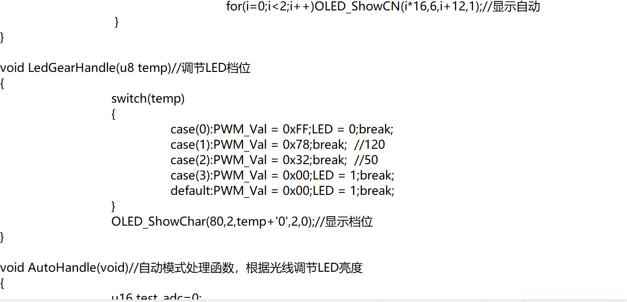 在自动模式下,在不同光照条件下采用PWM调节方案;在手动模式下,通过按键实现对亮度的增减调节,并且亮度设置共有三档。