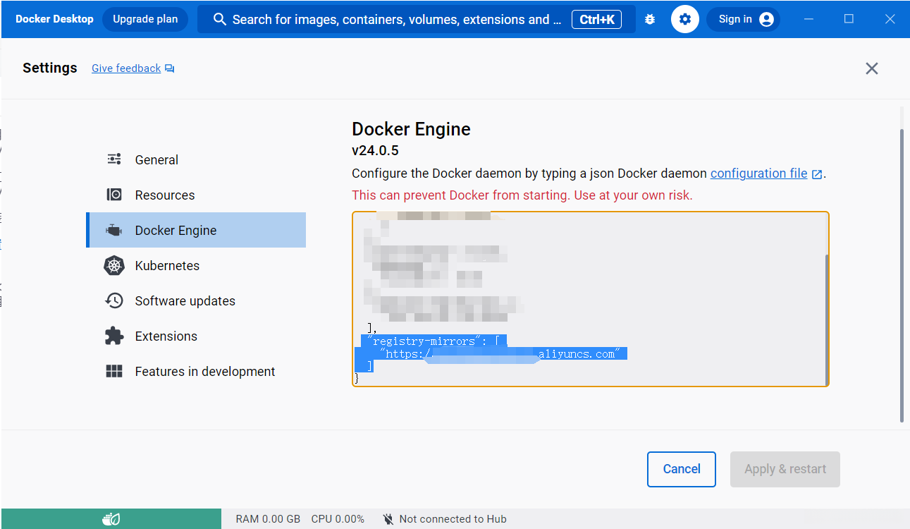 5、在Docker Desktop设置中配置阿里云镜像源: