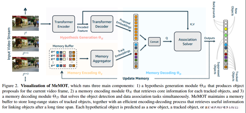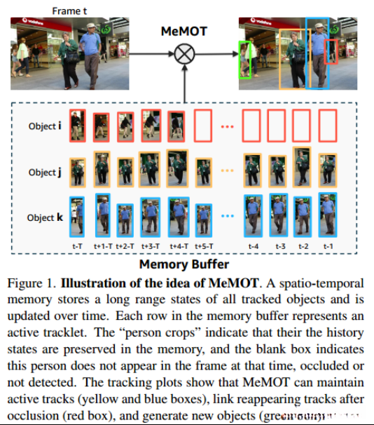 图1MeMOT概念。时空记忆存储单元(Memory Buffer)存储所有跟踪对象的长时间状态,并随时间更新。内存缓冲区中的每一行都表示一个目标的活动tracklet。“person crops”****表示他们的历史状态保存在记忆中,空白框表示这个人当时没有出现在框架中,被遮挡或未被检测到。跟踪图显示,MeMOT可以保持活动轨迹(黄色和蓝色框),链接遮挡后重新出现的轨迹(红色框),并生成新的对象(绿色框)。