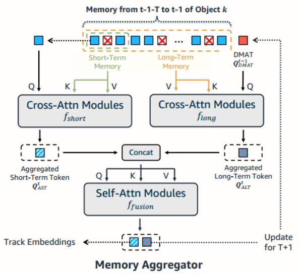 图3展示了记忆融合器(Memory Merger)的工作原理图示,该系统由三个注意力机制构成:第一组处理短时段内的去噪作用;第二组从长时域中捕获支撑性特征;第三组整合短时与长时信息的融合模块.在这一过程中,融合后的特征向量(Embedding)将被用于构建轨道嵌入体(Embedding),并在下一时间步更新DMAT(蓝红查询)中使用