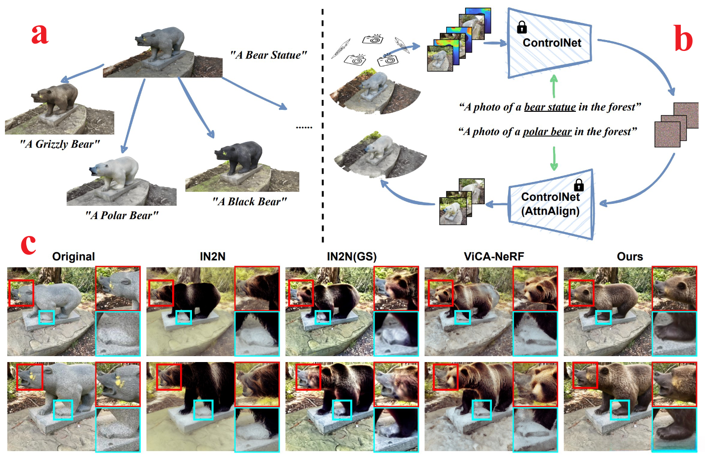 (b)该过程是通过修改3DGS渲染的图像并重新训练三维模型来实现的。