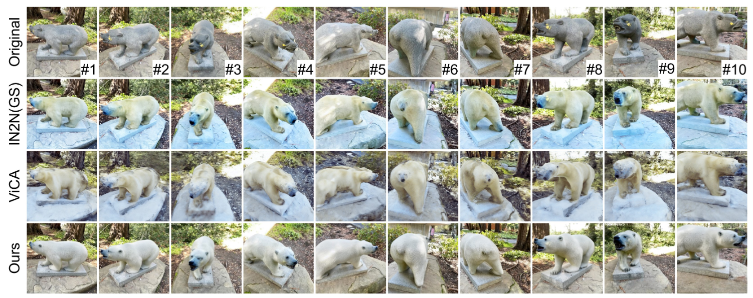 Both \IN2N(GS) and ViCA are affected by editing inconsistencies (as indicated in View #1,2,4,8,10). These methods result in spots and a bear’s face that appears blurry. Additionally, these methods are not immune to the face-on-the-back issue. Our approach successfully addresses these issues.