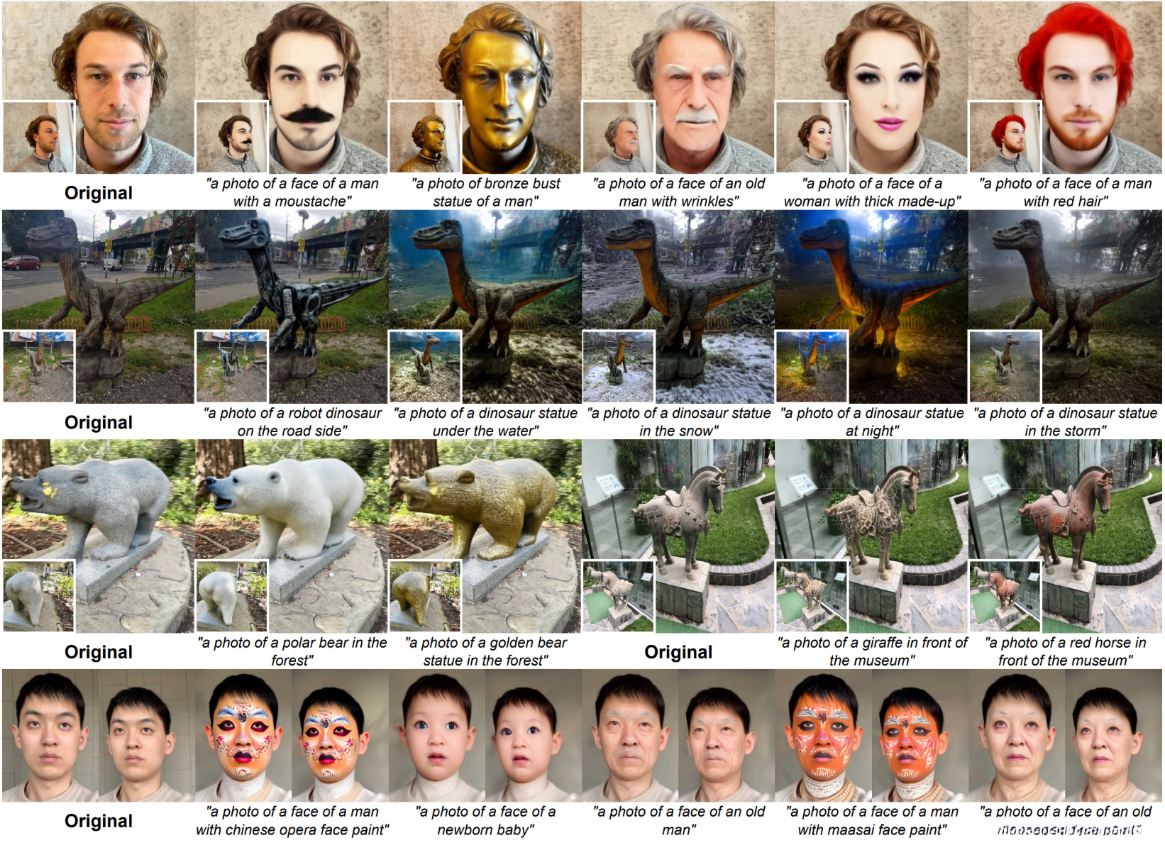 Various scenarios demonstrate a range of text-based editing operations across different scenes, encompassing object modifications and environment adjustments. Such as altering the visual characteristics and demographic attributes of the subject being edited, as well as reconfiguring their surroundings.