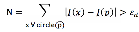 其中, I(p) 为当前像素点,ed 为像素差异阈值,N 为符合条件的像素点个数,如果数量大于 #Max(一般取总像素个数的75%),则认为 p 为特征点。