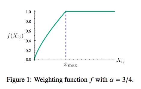 这个loss function的基本形式就是最简单的mean square loss,只不过在此基础上加了一个权重函数 f(Xij)f(Xij),那么这个函数起了什么作用,为什么要添加这个函数呢?我们知道在一个语料库中,肯定存在很多单词他们在一起出现的次数是很多的(frequent co-occurrences),那么我们希望: