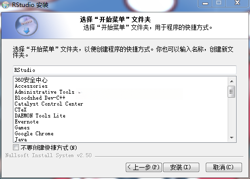 点击安装程序RStudio-0.99.879.exe转至欢迎界面,请依次完成以下操作:指定安装路径位置;指定开始菜单文件夹的名称;完成安装过程。