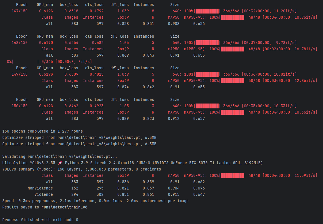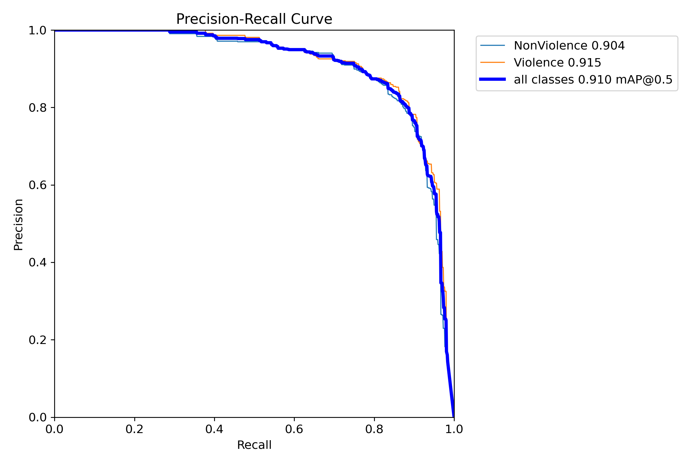 通过该图可以看出YOLOv8模型在打架等扰乱行为检测任务中的训练流程及其验证结果。验证结果显示,在暴力与非暴力行为的检测任务中,YOLOv8模型表现出色。其中,在mAP50指标上表现突出,在召回率方面也取得了显著成绩。其精确度也非常接近,在对两类行为的识别能力上达到了较为均衡的效果。