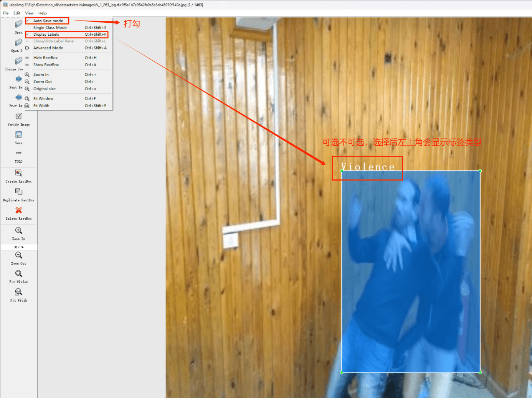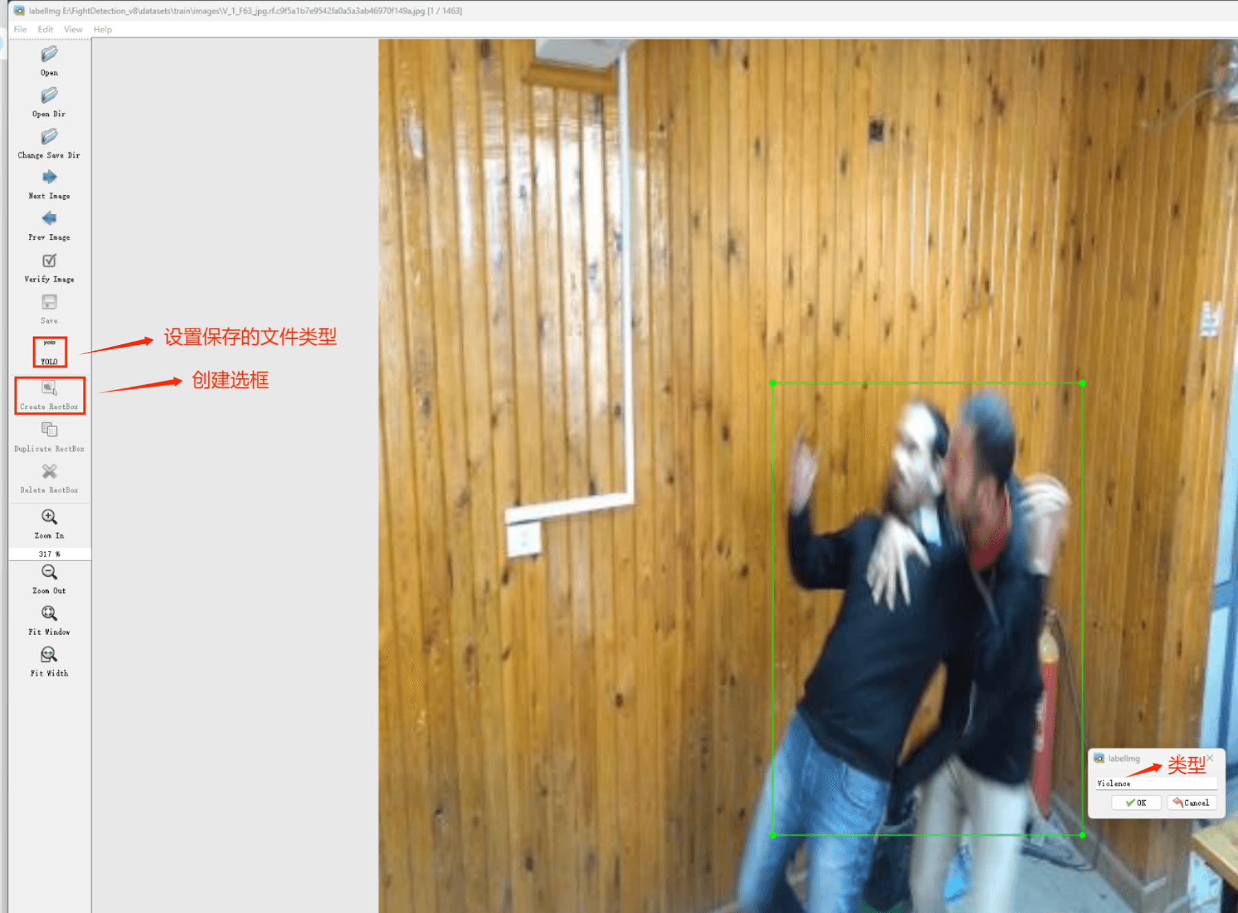 采用Labelimg标注工具从包含多种多样与暴力异常行为相关的图像中进行采集和标注。将分为两个检测类别:一个是NonViolence(代表非暴力),另一个是Violence(代表暴力)。