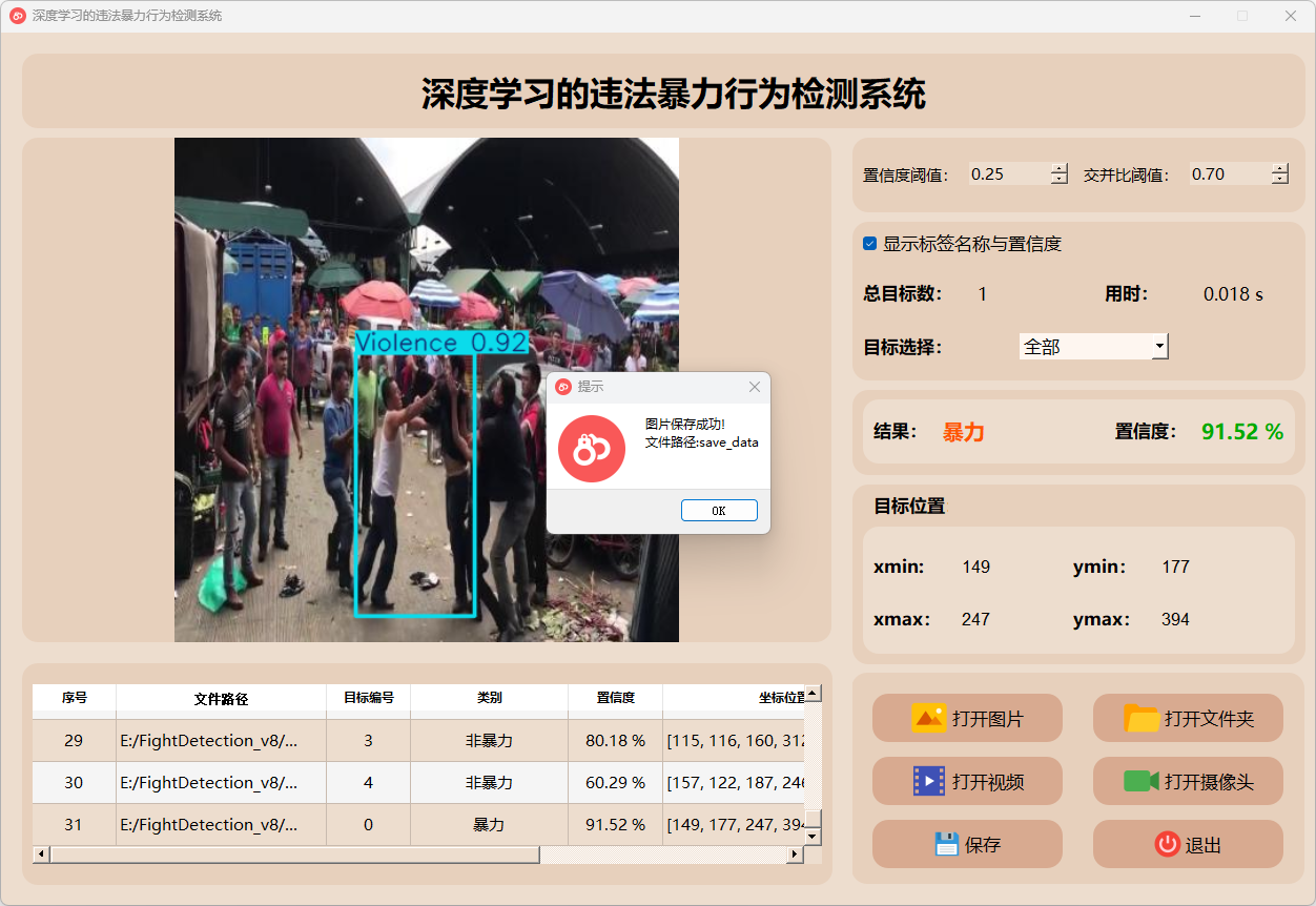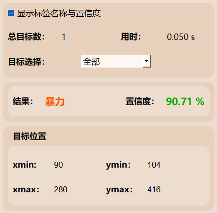 检测结果:系统通过视觉分析技术自动识别图片中的暴力行为,并对发现的目标进行详细标注与分析。具体而言,在该过程中系统能够准确计算出目标数量、完成时间以及各类别目标的分类特征,并记录下各目标的具体位置坐标详细信息