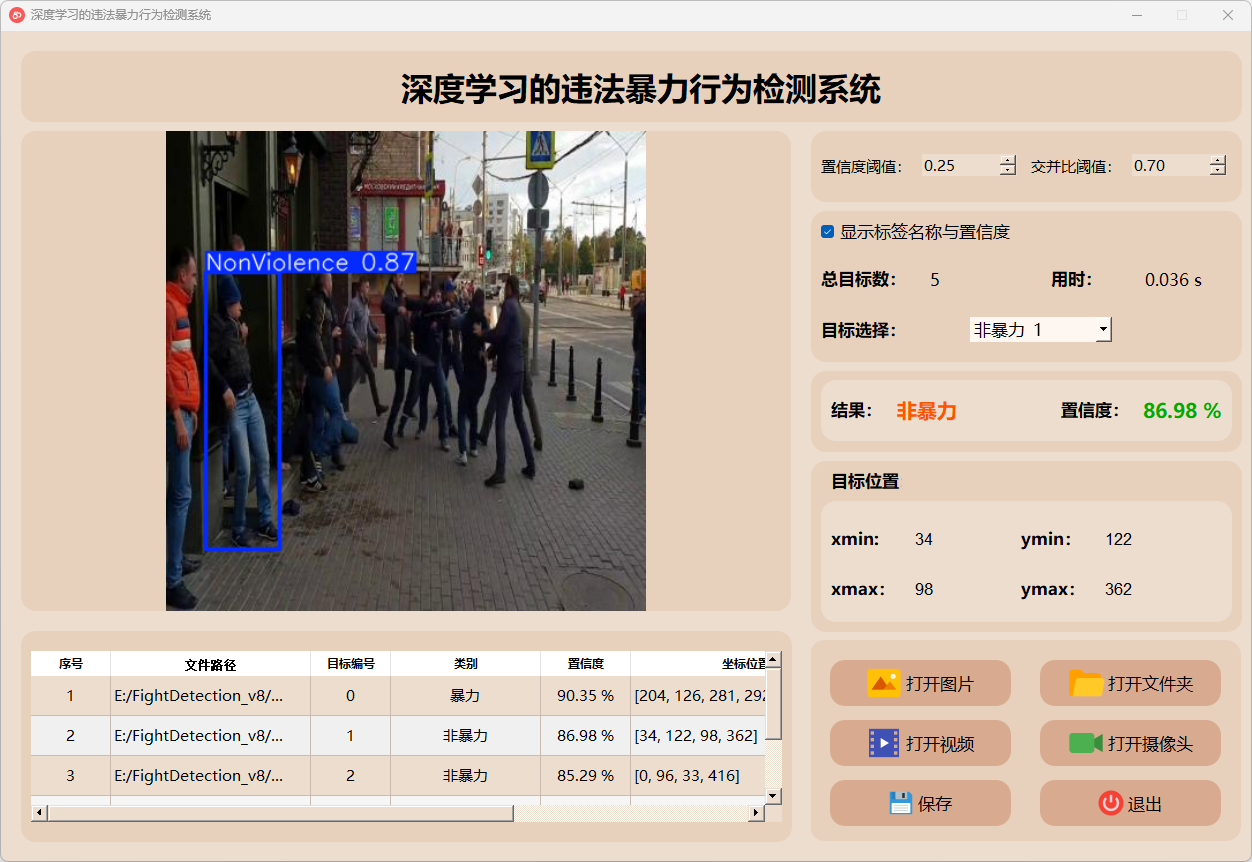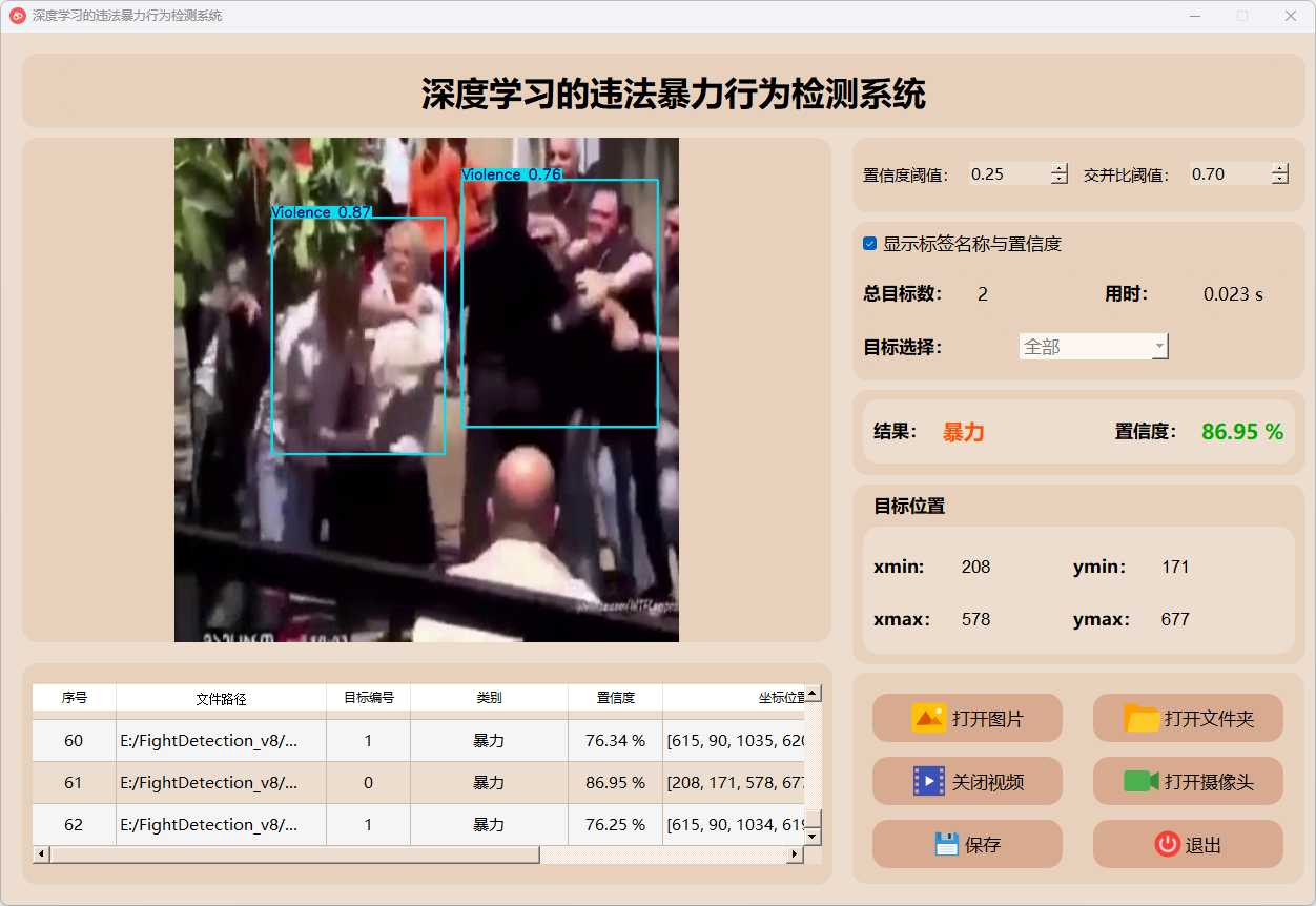 这个界面呈现了系统在视频帧中进行多目标检测的能力,并具备精确识别暴力行为的能力。它不仅实现了对暴力行为的自动检测功能,在结果展示方面也提供了详细的行为检测结果以及相应的置信度评分