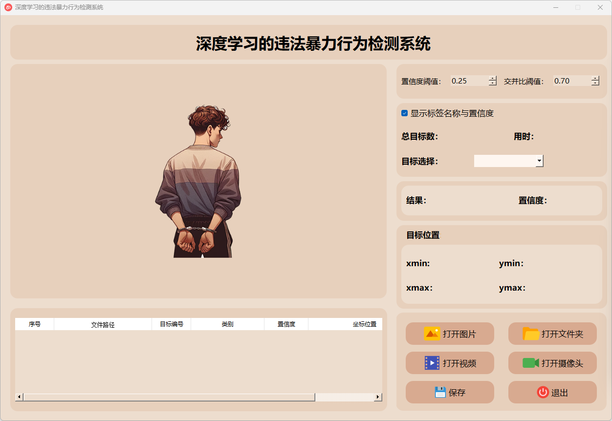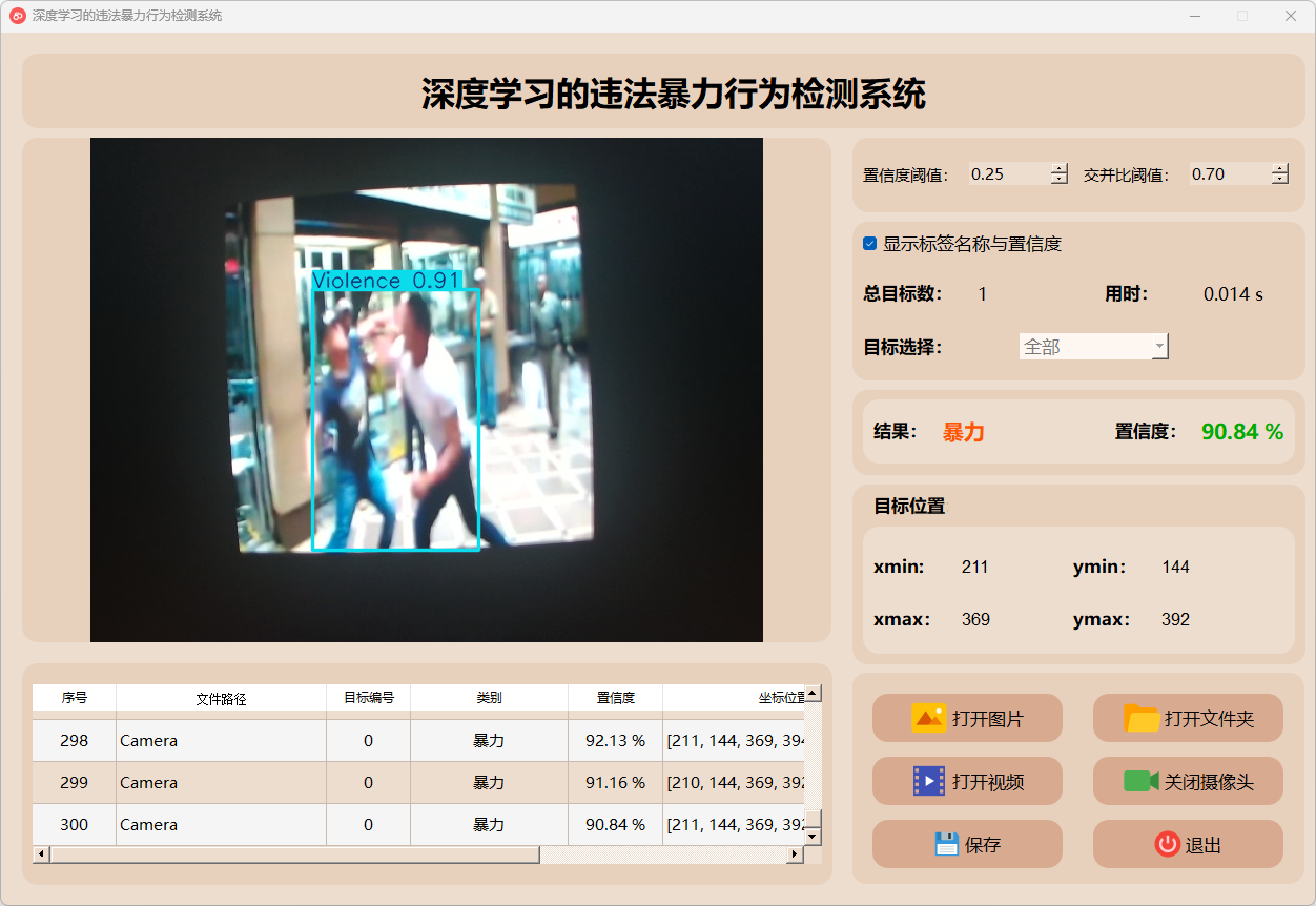 检测结果:摄像头与系统实现了在线数据传输,在线处理来自摄像头的画面数据。实时显示摄像头画面的同时,在图像中标注了暴力行为的位置。表格下方记录了每帧画面数据的详细信息。