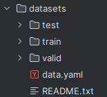 图片数据的存放格式如下,在项目目录中创建datasets目录,并将检测的图片按照训练集与验证集进行归类放置于该目录下。