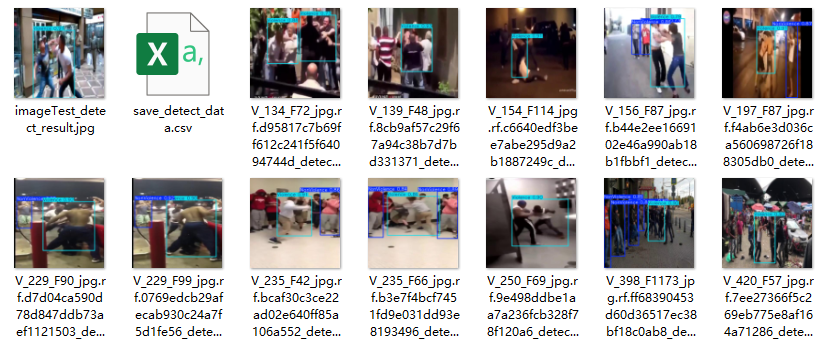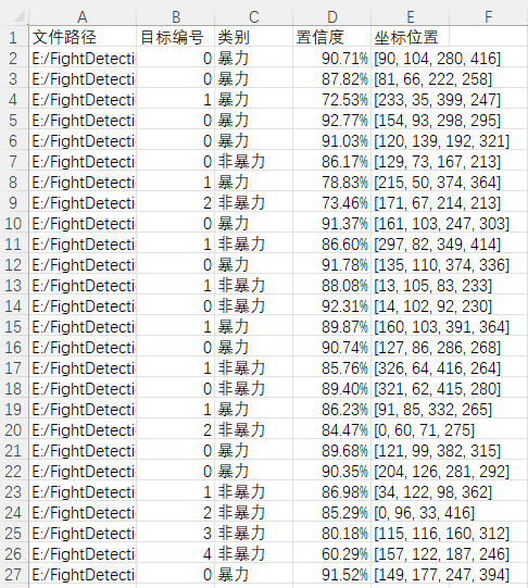 这张图记录了打架异常行为检测系统的一次检测结果,包含具体的测试时间、涉及的行为类型、每项行为所对应的信心值以及目标位置信息数据等详细信息。通过该界面用户能够查看并分析这些检测结果,并从而提高对违法暴力行为预警效率的效果。