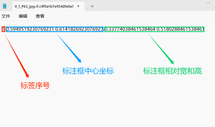标记信息文件的名称与图片相同。该文件由N行、5列的数据构成。每一行代表一个被标注的目标:第一列为类别ID;第二和第三列为目标中心点的相对坐标;第四和第五列分别为目标框的相对宽度和高度。