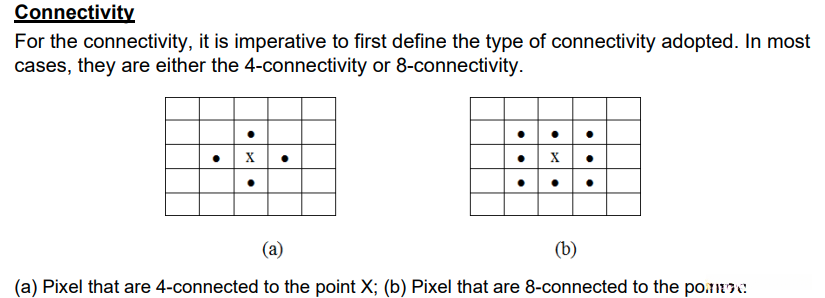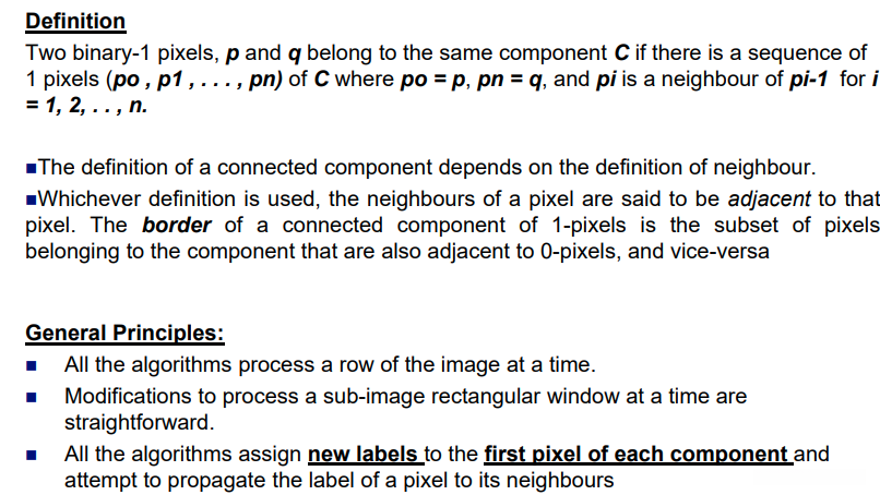 #一旦产生了二元图像,就会采用一个连接成分标记算子,将二元-1像素分组为最大的连接区域。这些区域被称为二元图像的连接成分,相关的运算符被称为连接成分运算符。