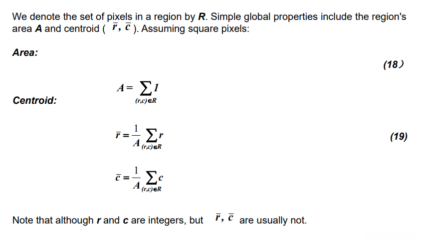 A variety of property measurements can be made on each region on the basis of the region's shape and the gray level values for those pixels that participate in the region. Examples: