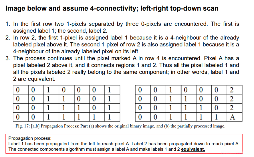 1.The first pass performs label propagation, just like the procedure described above. Whenever a situation arises in which two different labels can propagate to the same pixel, the smaller label propagates and each such equivalence found is entered in an equivalence table.