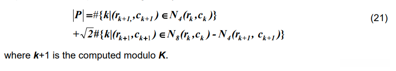 and each pair of successive pixels in the sequence being neighbours, including the first and last pixels. Then the perimeter is given by: