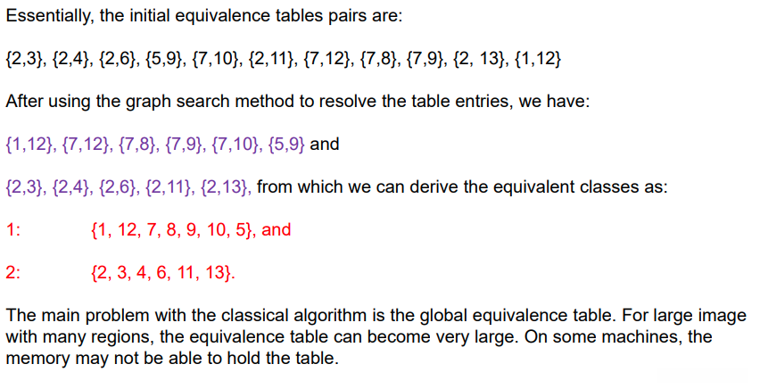 #经典算法的主要问题是全局等值表。对于有许多区域的大图像,等价表会变得非常大。在某些机器上,内存可能无法容纳该表。