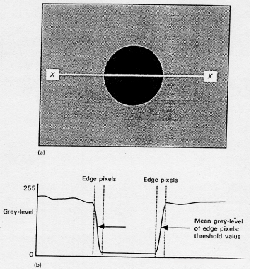 Fig:Using edge pixels to select a threshold: (a) image of dark, round object on a light background with section X-X shown; (b) profile of image intensity along section X-X.