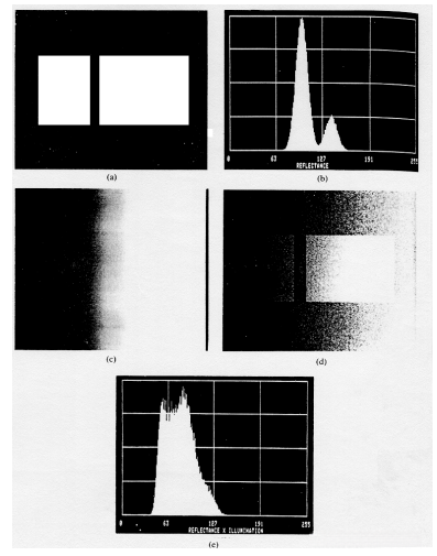 Fig. 10 shows the effect of illumination. FIg.10(a) and Fig 10(c) are the computer generated reflectance and illumination functions, respectively. Fig. 10(b) is the well defined bi-modal histogram of Fig. 10(a). Fig 10(c) is obtained through Eq. (3), and the resulting image is shown in Fig. 10(d) with the histogram shown in Fig. 10(e).