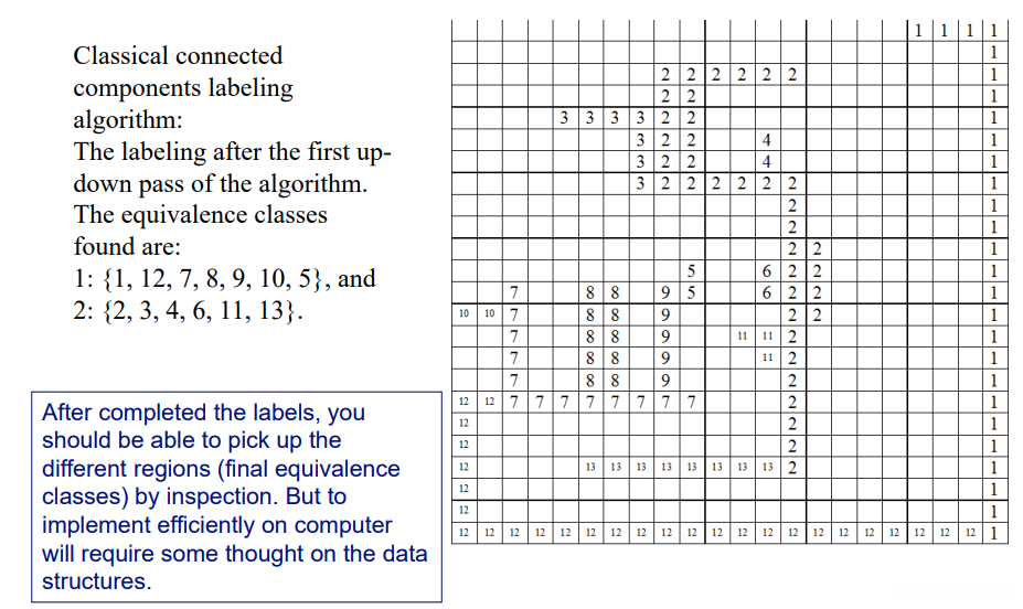 3.A second pass through the image performs a translation, assigning to each pixel the label of the equivalence class of its pass-1 label.