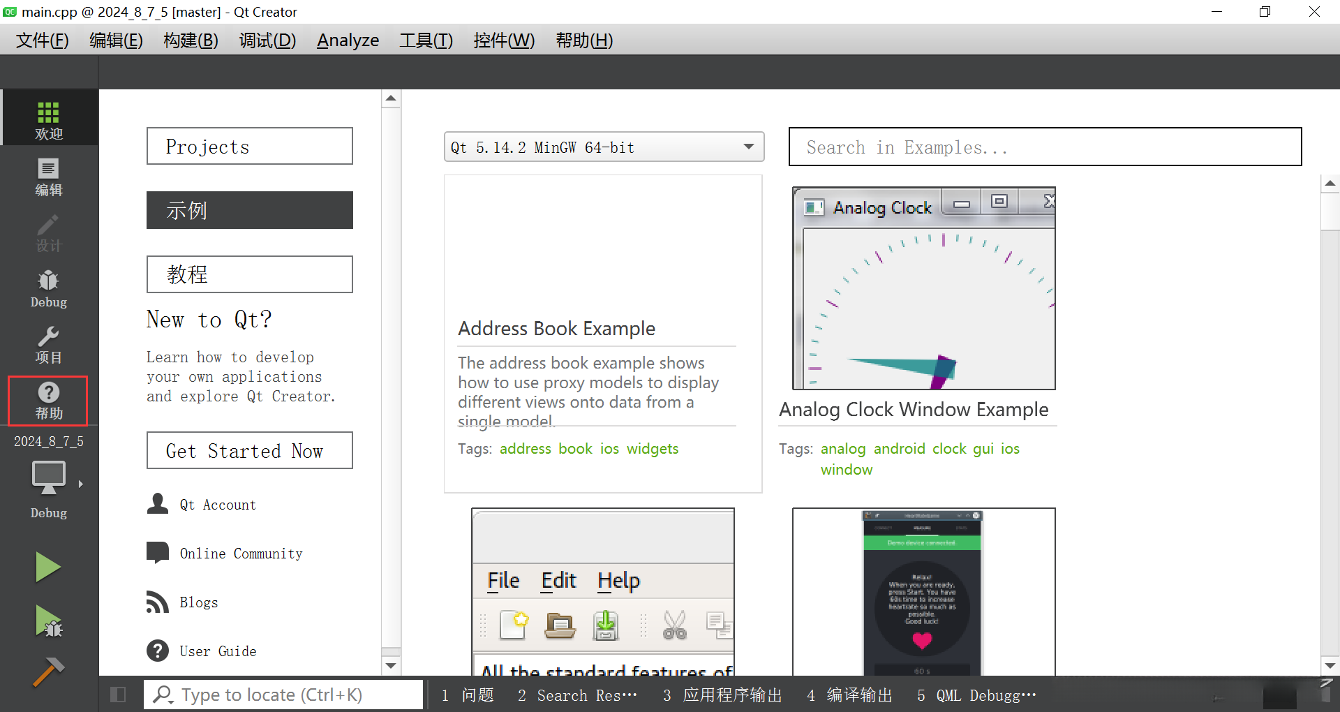2.Qt Creator左侧边栏中直接用鼠标单击“帮助”按钮。