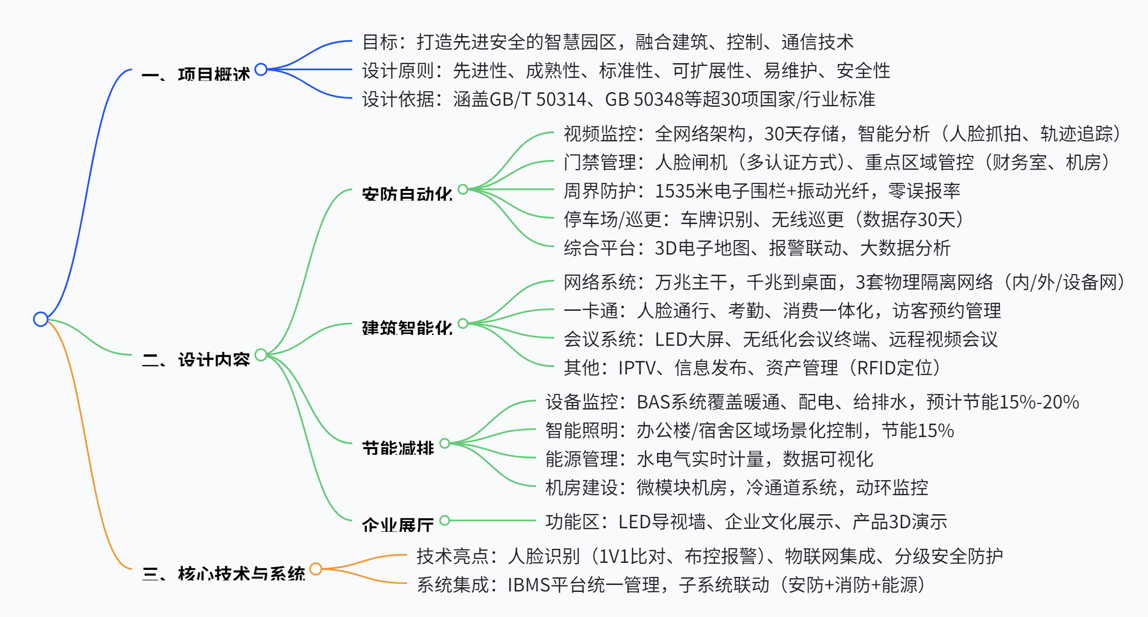 - 整体架构三大核心模块 :安防自动化 :构建 “人、车、物、环” 立体防控体系,集成视频监控、门禁、周界报警等 8 大系统。建筑智能化 :部署万兆网络(3 套物理隔离)、一卡通、多媒体会议等 10 + 子系统,支持智慧办公与生产。节能减排 :通过 BAS 设备监控、智能照明、能源管理系统,实现园区能效优化(预计节能 15%-20%)。